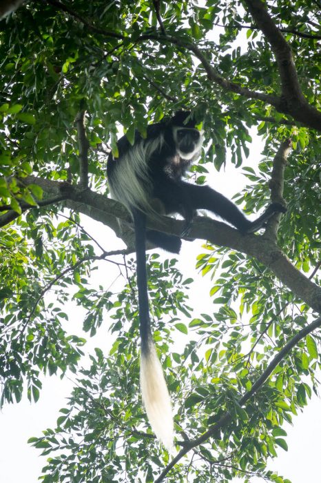 Black & White Colobus: Şimdiye kadar gördüğüm maymun türleri arasında estetik görünümü ile en hayran olduğum tür. Simsiyah maymunun omzundan beline doğru uzanan beyaz tüyleri bir pelerini andırıken, yüzünü de bir tutam beyaz püskül çevreliyor, siyah kuyruklarının ucu ise beyaz bir öbek ile tamamlanıyor. Colobus maymunlarının parmakları yok, ancak kanca gibi elleri ile ağaçların dallarına mükemmel bir şekilde tutunup ağaçtan ağaca atlayıp zıplayabiliyor ve de yaprakları rahatlıkla pençeleri ile yiyebiliyorlar. Zaman zaman yerde de görebiliyorsunuz bu siyah&beyaz muhteşem hayvanları. Ağaçların tepelerinden aşağıya inip topraktaki kili yiyerek midelerindeki asit seviyesini dengeleyip, hazmettikleri bitki toksinlerinin nötralize ediyorlarmış.