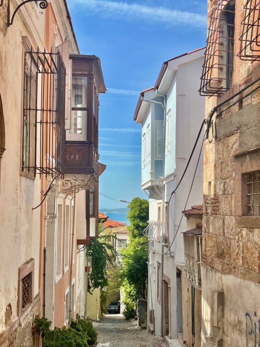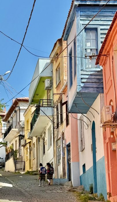 Eski Ayvalık mahallelerinde taş Rum evleri arasındaki arnavut kaldırımlarda koşturmak,