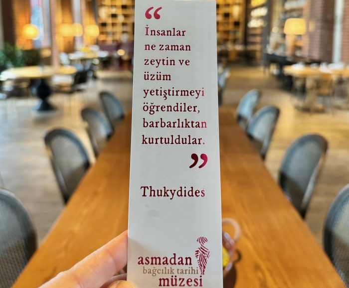 Kapıdan girdiğinizde MÖ 5’inci yüzyılda yaşamış tarihçi Thukydides’e ait şu söz sizi karşılıyor: ‘İnsanlar ne zaman zeytin ve üzüm yetiştirmeyi öğrendiler, barbarlıktan kurtuldular’