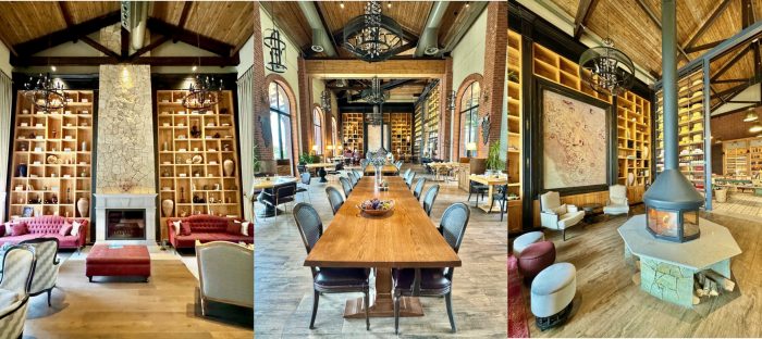 İçeri girdiğimde görkemini çok daha iyi anlama şansı buldum. Ahşap, taş ve camın modern rustik bir harmanı ile işlenmiş iç mekan dokusu, mekana inanılmaz bir ferahlık ve derinlik veren yüksek tavanları, birbirinden estetik kütüphaneleri, şömineleri, mobilyaları ve de her biri özenle seçilmiş dekorasyon objeleri ve tasarımlar ile sanki modern bir şatoya adım atmışsınız hissi uyandırıyor Bengodi. İnsanın içine hayranlık dolduran, içinde bulunmaktan da büyük bir mutluluk duyduğu, gelenek ve günümüzün zevkle harmanlandığı bir masal şatosu gibi.