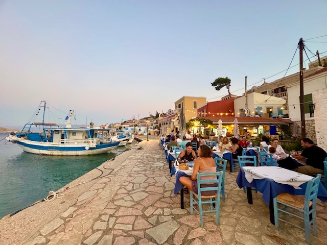 Akşamları limanın kordon boyunda hepsi birbirinden güzel tavernalar var. Hata yapmanıza imkan yok, çünkü tüm deniz mahsullerini taze günlük tutan bir balıkçı kasabası Halki.