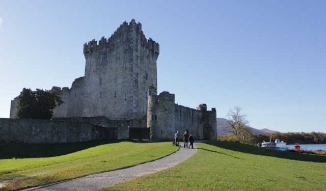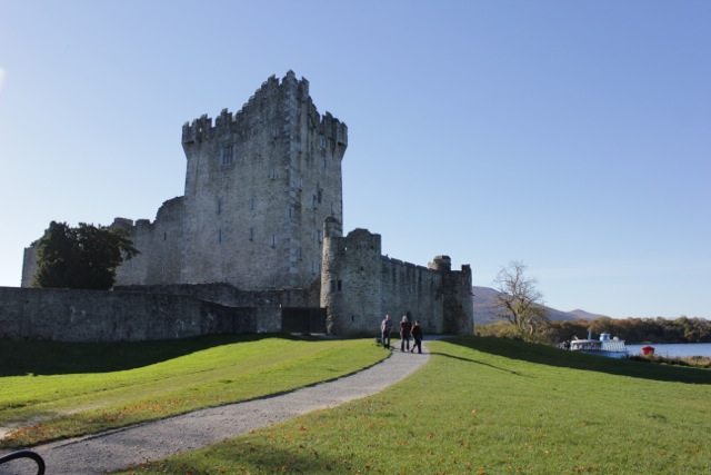 Şehrin içinden meyvelerimizi yiyerek, milli parka doğru yürüyoruz, sağ yanımızda küçük bir dere akıyor, karşımızdan gelen herkes bize ve birbirlerine gülümseyerek selam veriyorlar, biz de ilk selam verenlere acemice karşılık veriyoruz; sonrasında alışıyoruz hemen bu güzel adete. Kamil buna hiç şaşırmıyor, ani bir selamlamayı karşılamada bizim gibi acemi değil, malum kendisi uzun zamandır İrlanda’da yaşıyor. Uzunca bir yürüyüş sonrası ormanın içinden bir açıklığa doğru çıkıyoruz ve Ross Castle karşımızda bütün ihtişamıyla beliriveriyor. Parıldayan güneş, gölde yüzen ördekler, genelde görmeye alıştığımızdan farklı görünen kargalar, paçalı atların çektiği ekose battaniyeli faytonlar, cıvıldayan çocuklar… Sanki bir peri masalında gibiyiz…