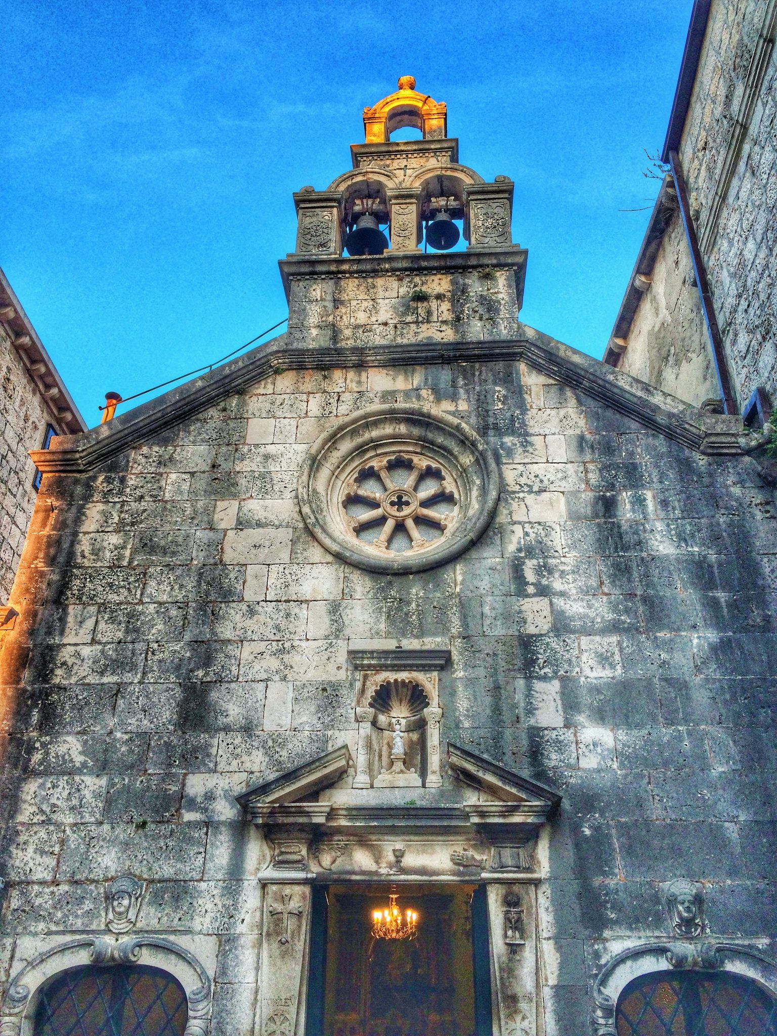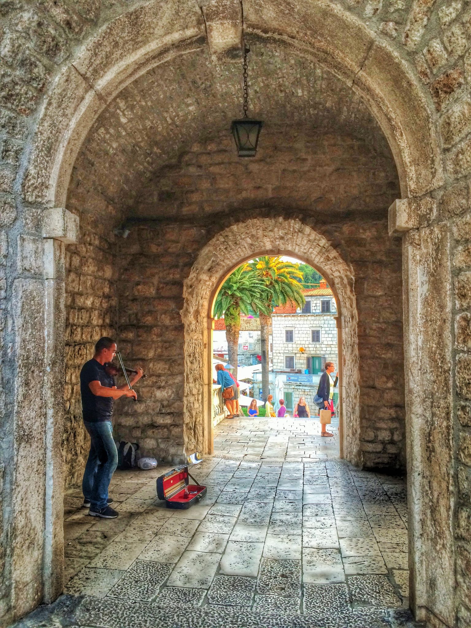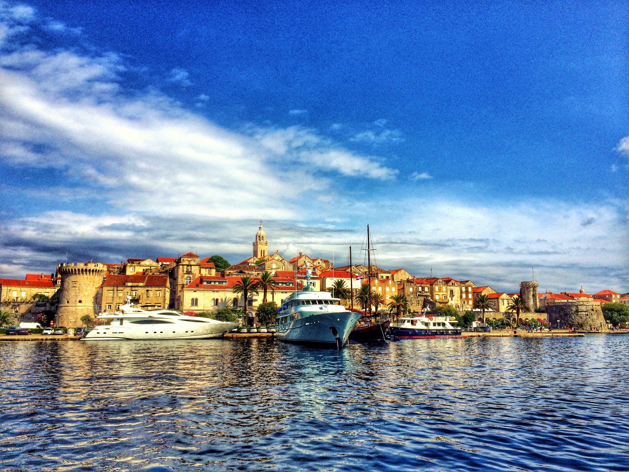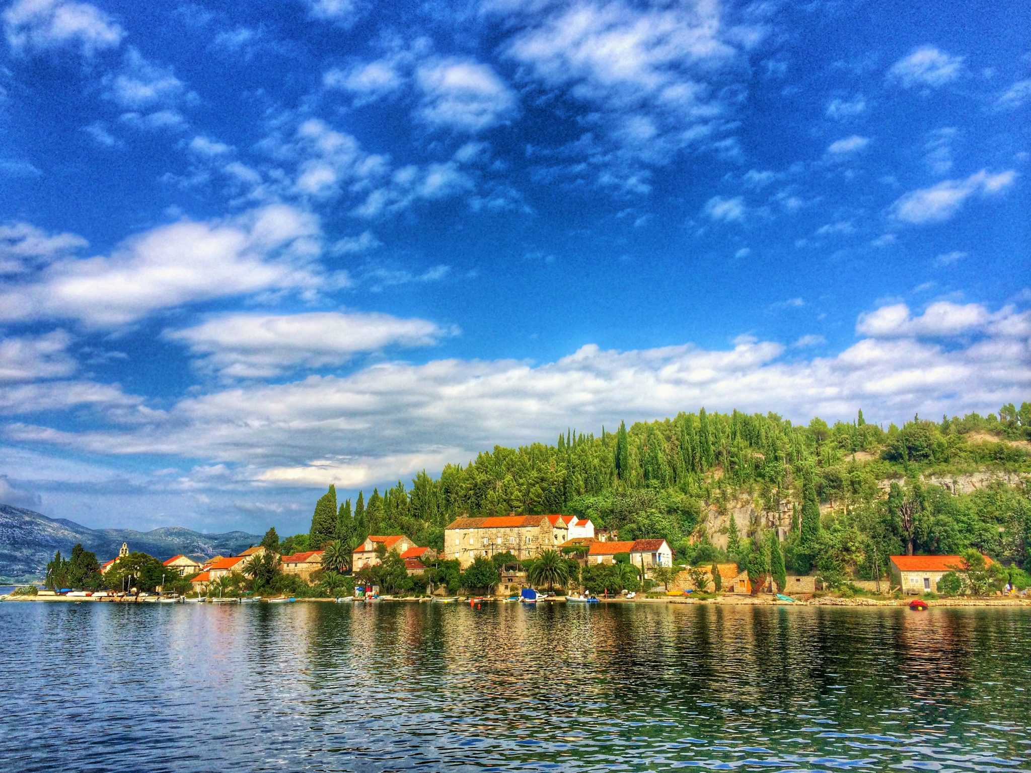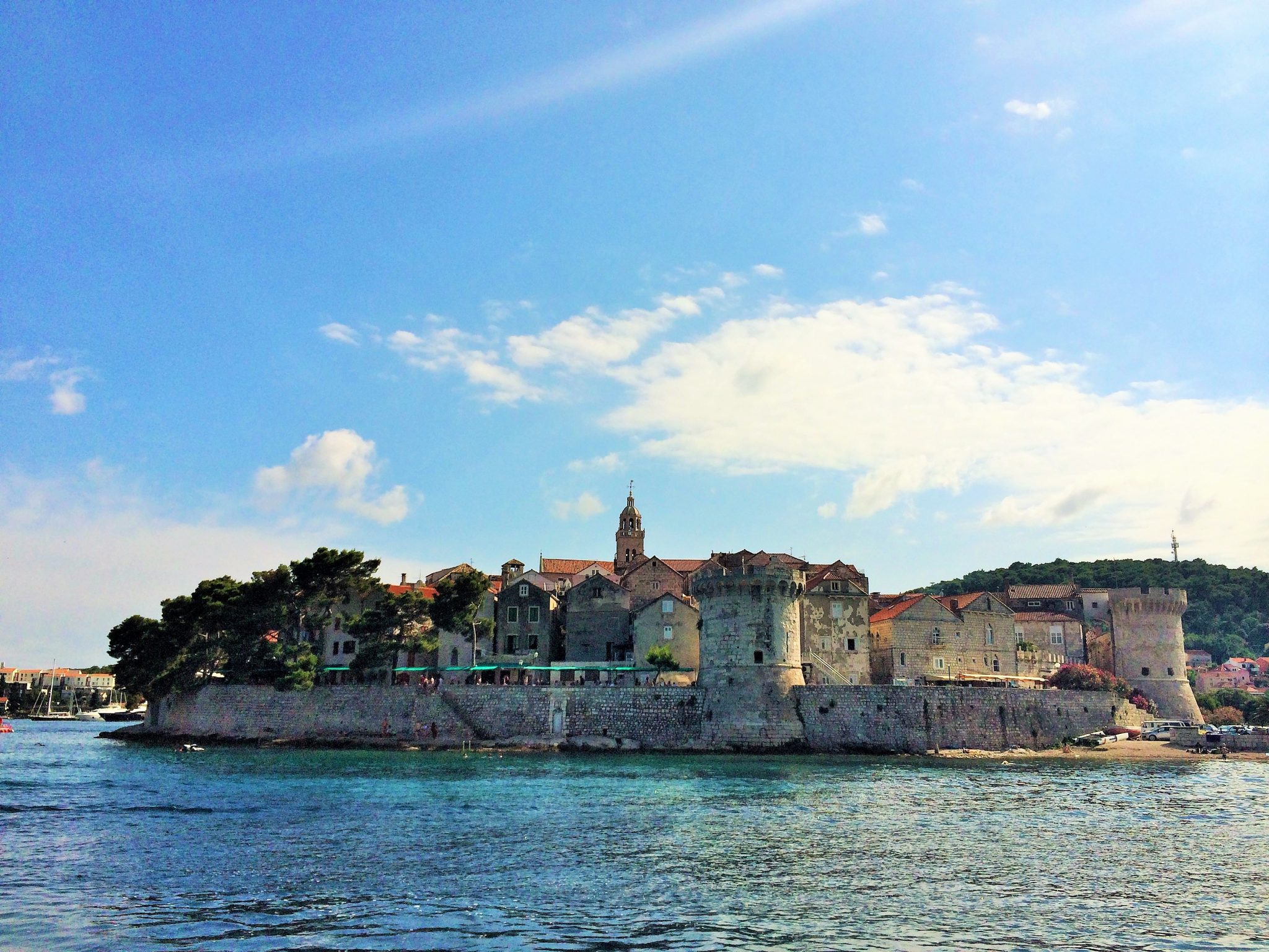 Oval bir tepede surların içindeki ufacık eski şehir, taş evlerin arasındaki labirent gibi daracık sokakları, kemerli köprüleri, 14.yy’dan kalma katedrali, Gotik ve Rönesans mimarisindeki minicik kiliseler ve saraylar ile çevrili meydanları ile Korčula adeta minyatür bir Dubrovnik. Deniz odaklı bir tatilde hele bir adada böyle görkemli bir eski şehir beklemiyorsunuz işin doğrusu. Daracık sokaklar şehrin içinde rüzgarın ve güneşin etkisini hafifletmek için, yaprakların damarları gibi ana damardan aşağı akar biçimde tasarlanmış. Ve sokağın iki yakasındaki evler birbirine o kadar yakın ki, damdan dama atlayarak geçmek mümkün. İşte bu sebeple günün en sıcak saatinde bile gölge olan sokaklarda serin serin yürümek, yüzlerce yıllık taş mimariyi hayranlıkla seyretmek çok keyifli.
