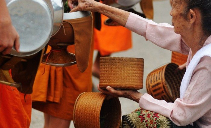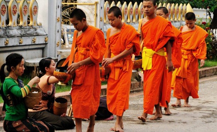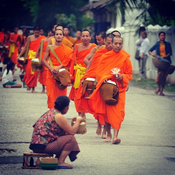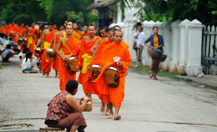 Daha gün doğmadan hayata başlayan Luang Prabang’ın en enteresan geleneği Budist rahiplerin sabah zekat toplama seremonisi. Sabahın ilk ışıkları ile tüm Budist rahipler manastırlardan çıkarak yol boyunca dizilmiş halkın onlara sunduğu yiyecek bağışlarını topluyor. Ve rahipler 11’e kadar topladıkları yiyecekleri yedikten sonra gün boyu başka birşey yemiyorlar.