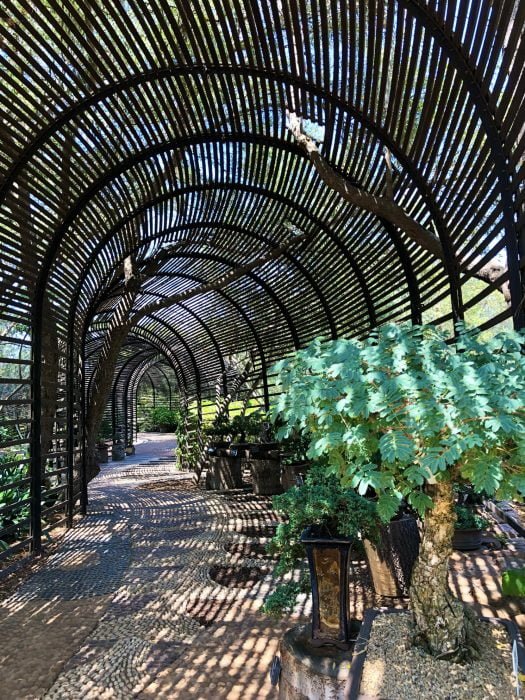 Puff Adder yılanını temsil eden, kıvrılarak uzayıp giden çelik entelasyon gölgelik içinde dünyanın dört bir köşesinden gelen bonzai türü minik ağaçlar