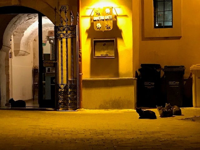Quattro Gatti’nin kapısında konukları karşılayan dört kedi