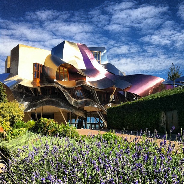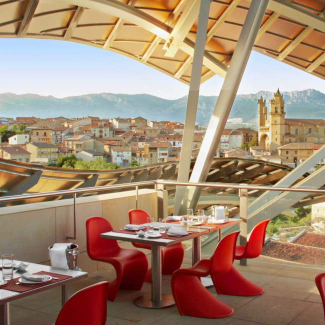 Doğal aliminyum ile kaplı, dalgalar gibi alçalıp yükselen çatısı, sıra sıra dizilmiş meşe fıçı kıvrımlarını anımsatan olağanüstü bir mimariye sahip. Sedir ve bakır kaplı ön cephesi ve çevresinde yer alan, İspanya’nın efsanevi mimari Gaudí’nin buluşu olan modern bir mozaik kaplama tekniği ile dizilmiş krem renkli porselen parçacıklar, çatının metalik görüntüsünü yumuşatarak binayı toprak ile buluşturuyor. Arkasında yer alan Sierra de Cantabria dağları ve çevrelendiği bağlar ile mükemmel bir uyum yaratan bu futuristik bina, yukarıdan bakıldığında bir şarap kadehi görünümünü alıyor.