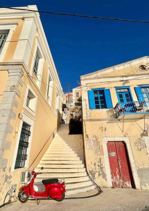 Eskiden Simi’nin tepelerindeki Horio kasabası ile limanı birleştiren tek bağlantı yolu olduğu için bu merdivenler üzerindeki evler Simi’nin en güzel evleri. Simi’liler neo klasik mimarideki bu evlere ‘halata’ derlermiş Çoğu 2. Dünya savaşında yıkılmış ancak ayakta kalanlar, 19. Yüzyılın ikinci yarısında Simi’nin gemicilik, gemi ticareti ve süngercilikten gelen ekonomik zenginliğin şahitliğini yapıyor.