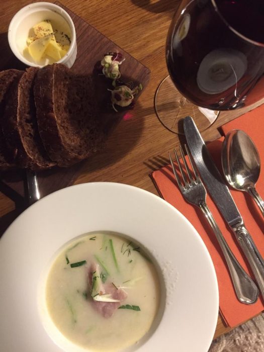 Mekanın şirinliği, servis yapanların tatlı dili, ve yemeklerin lezzeti bizi çok etkiledi. Önden kremalı balık çorbası, sonrasında geyik eti ve şarap. Siyah ekmeğin ve tereyağın özelliğini anlatamam. Ücret sadece 25 euro.